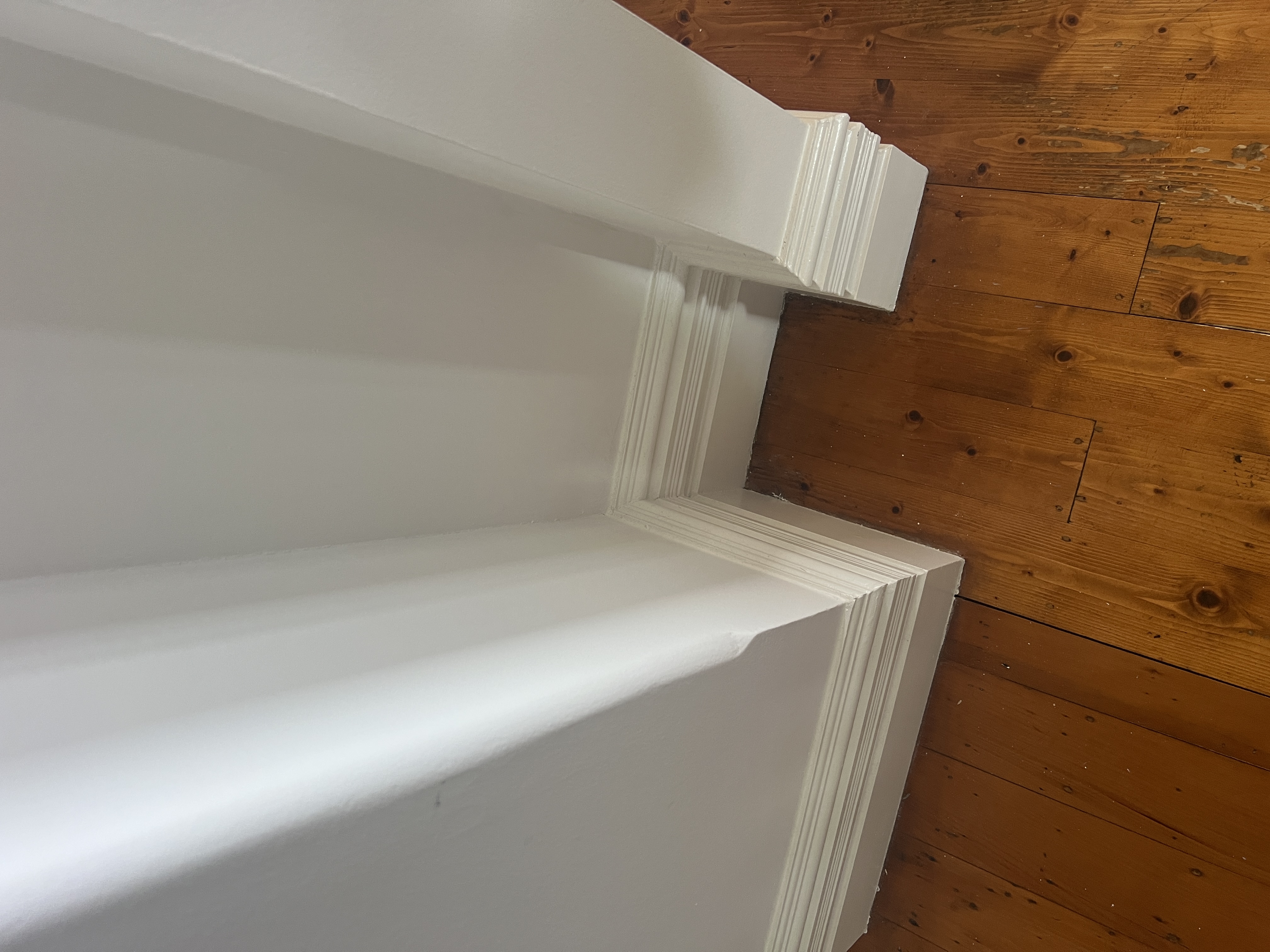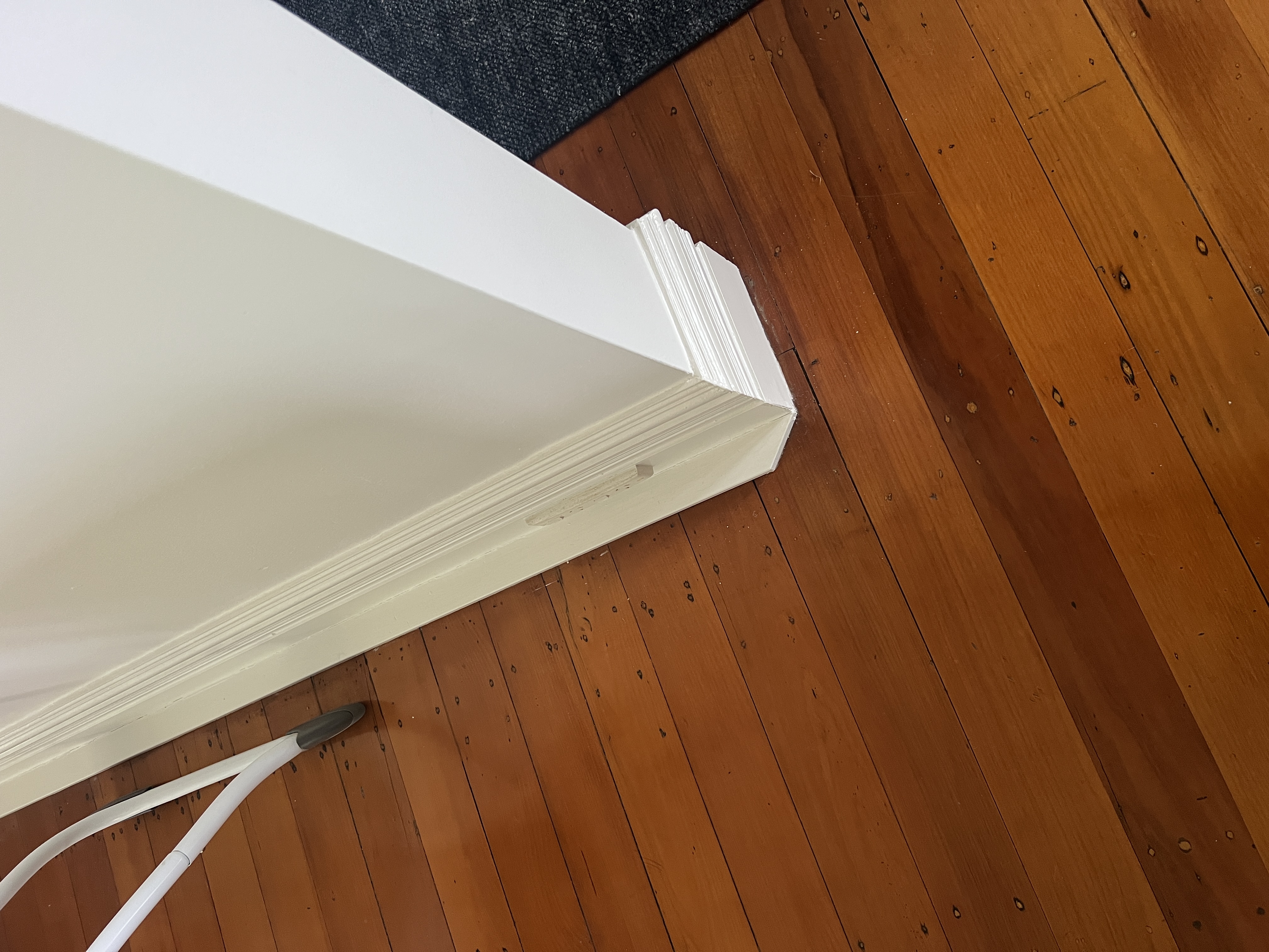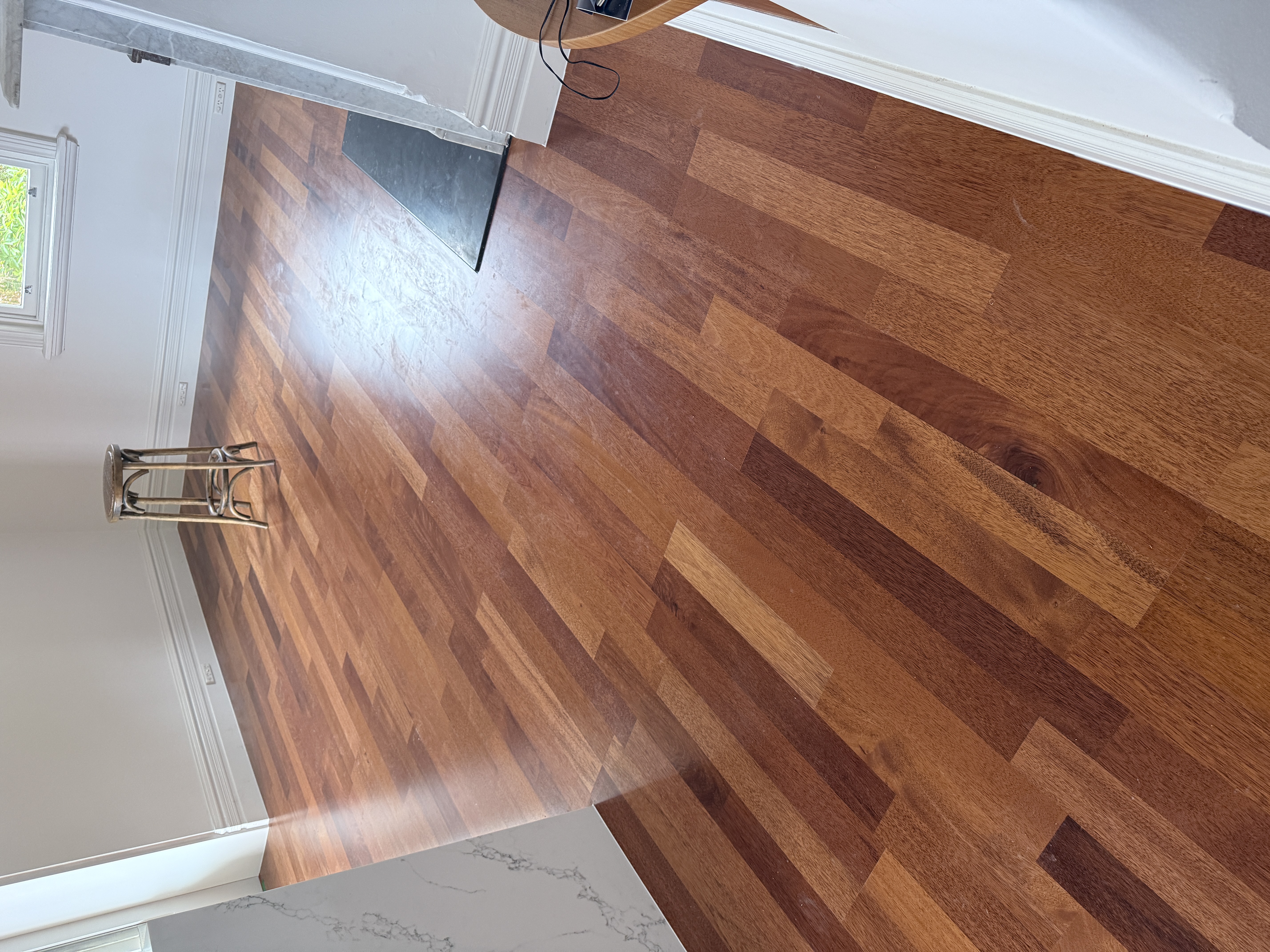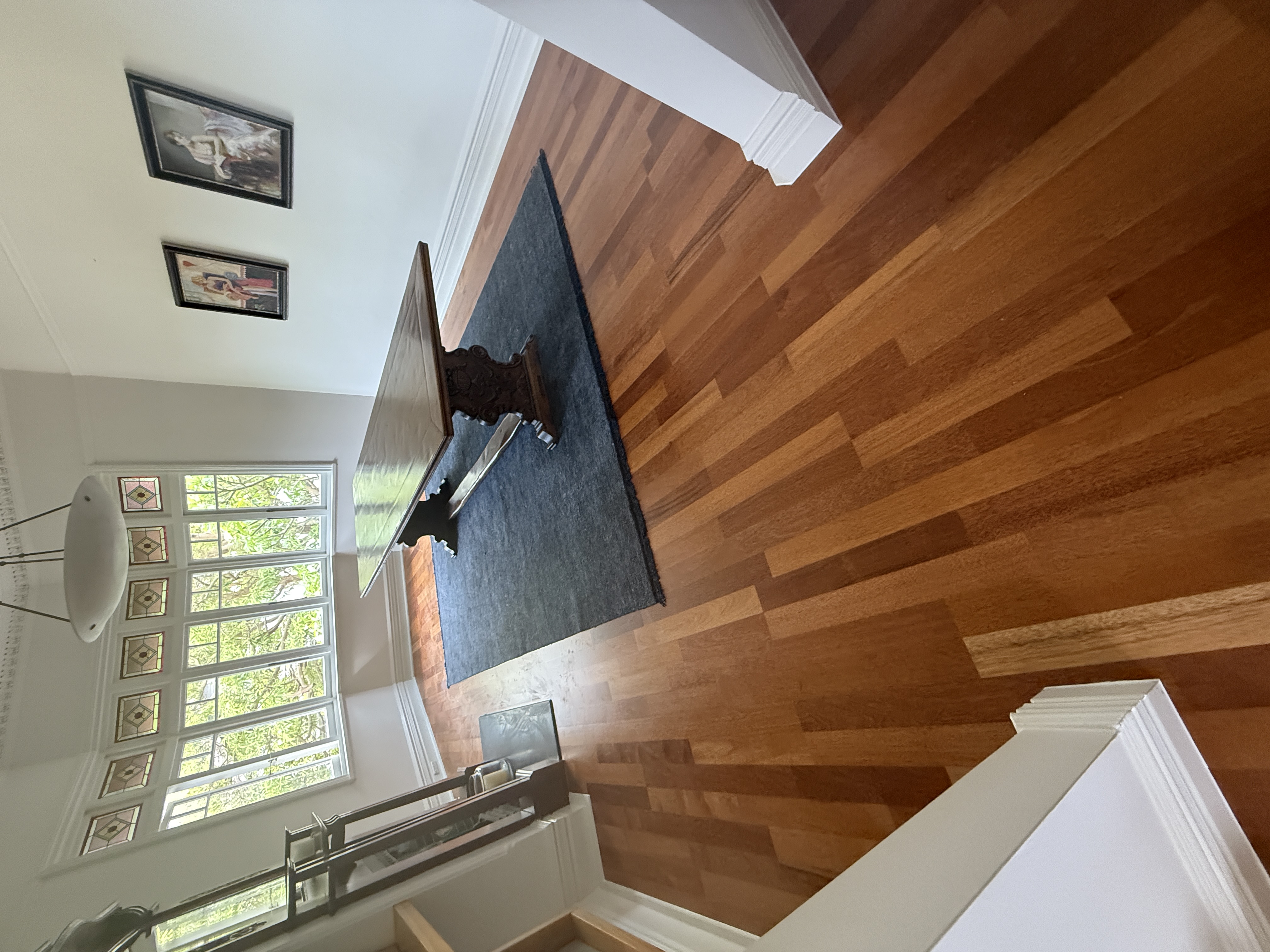 在实木板上安装90平米quickstep实木复合刮胶,skirting一圈留2-3mm打silicon。1节楼梯,只做楼梯头,不做立面。搬一张餐桌。